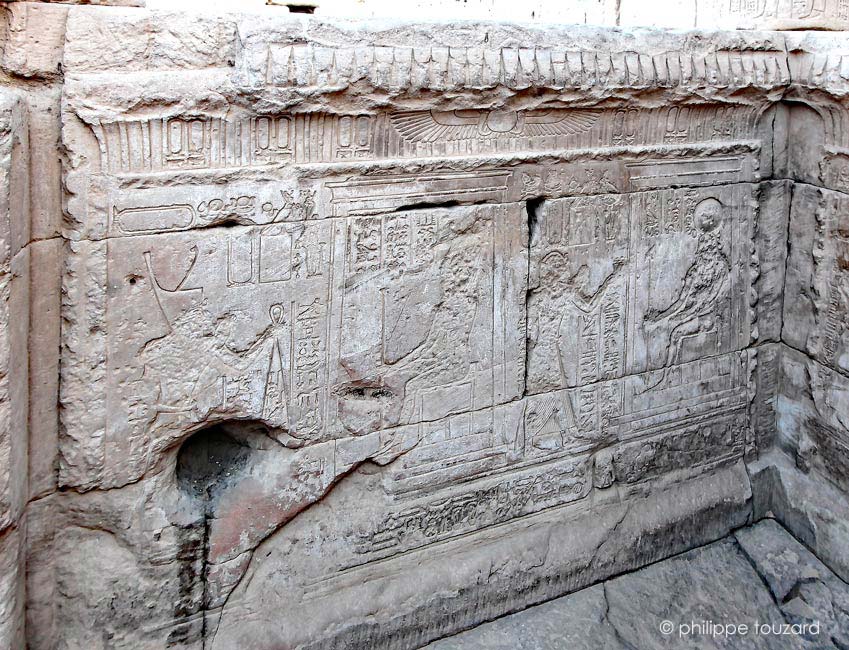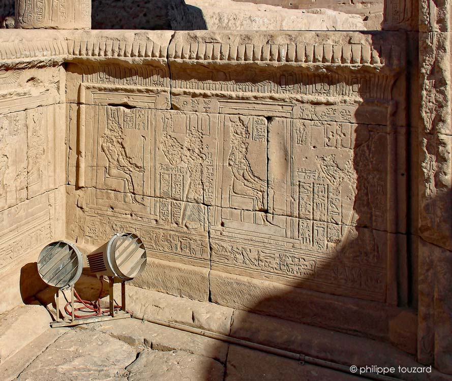 Ces deux scènes se trouvent à gauche de la porte d'entré Est. À gauche, le roi offre du natron à Horus.
