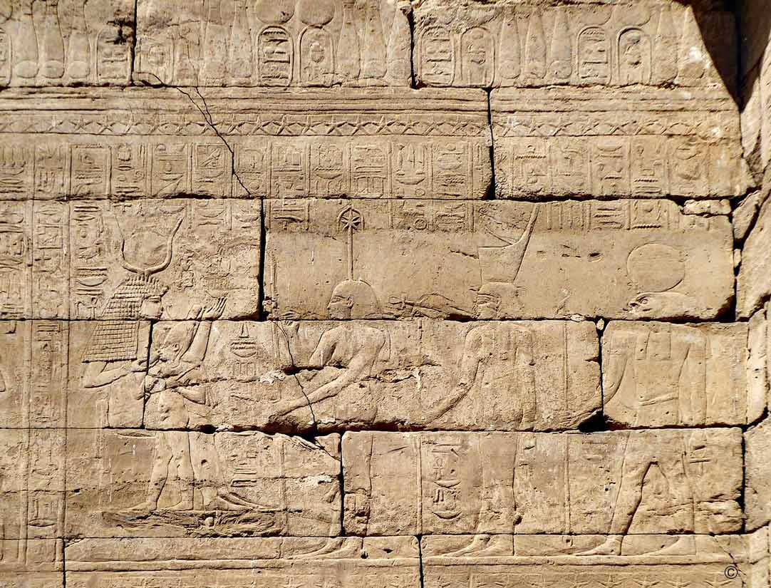 Hathor allaite elle-même son enfant. Devant elle, la déesse Sechat détermine ,le nombre de fêtes-Sed alloué au roi. La déesse Ouadjet apporte la couronne rouge qu'elle porte, au futur roi. À droite, Amon-Rê.