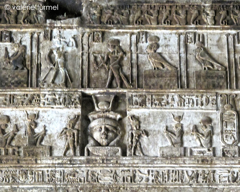Sur le registre supérieur, une profusion de dieux à l'iconographie et aux noms déconcertants protègent le temps et l'espace. En dessous, les têtes d(Hathor sont entourées des enfants-dieux et de dieux assis, les genoux pliés.