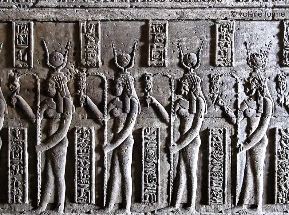 Sur le soubassement, une file de déesse qui jouent du sistre et du tambourin.