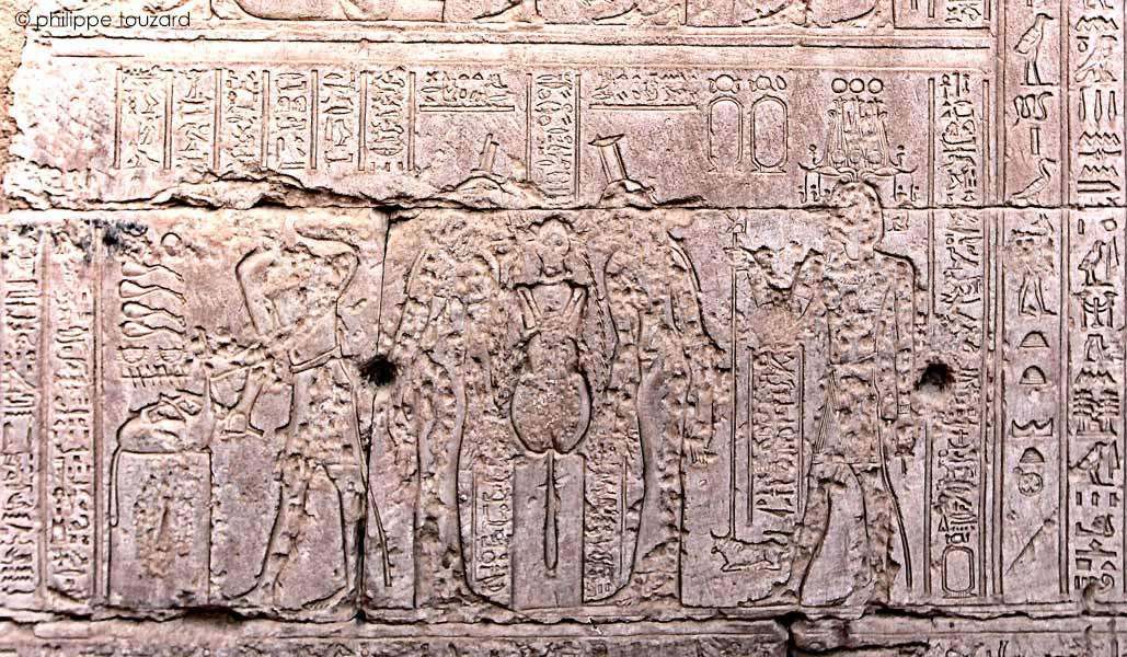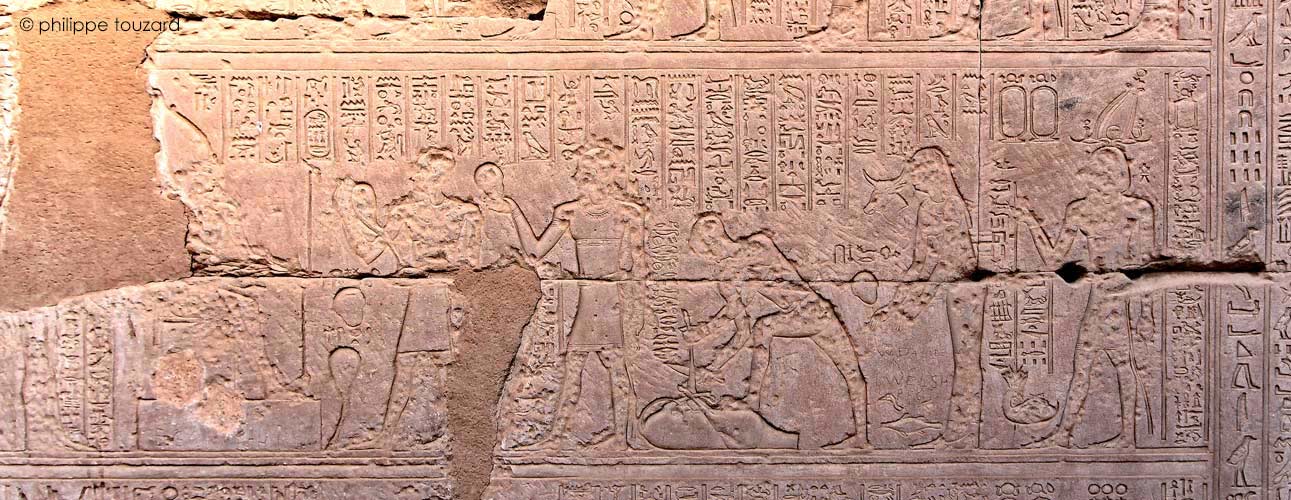 Le tableau décrit le rituel complet. les membres du taureau sont découpés. La cuisse et le cur sont présentés à Osiris. Une oie et un âne sont également sacrifiés (à droite, détail ci-dessous).