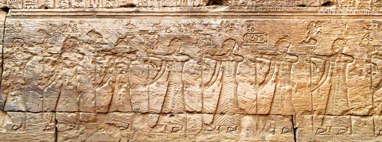 Le défilé des prêtres portant des pavois se déroulent sur le soubassement. Plusieurs nomes de Basse Égypte y sont représentés. (voir ci-dessous, S.Cauville, Les chapelles Osiriennes, Traduction, p.12 et 13)