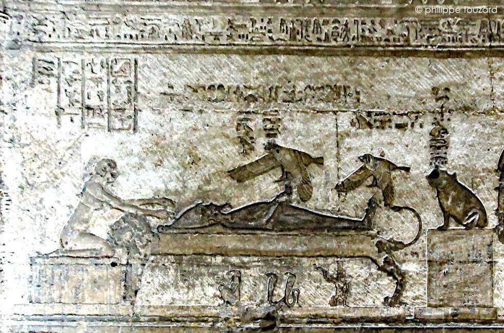 Cette scène est directement inspirée de la scène représentée dans le temple de Sethy 1er à Abydos. Osiris momifié porte la couronne blanche. Il tient son phallus sur lequel vient se poser I'oiselle Isis pour être fécondée et donner naissance à un héritier. Horus plane derrière Isis en faucon de plus petite taille. Hathor, souveraine de l'Occident, qui se lamente sur son frère, se penche vers Osiris, à gauche et à droite, Heket la grenouille, celle qui renouvelle la vie, se tient sur un socle.