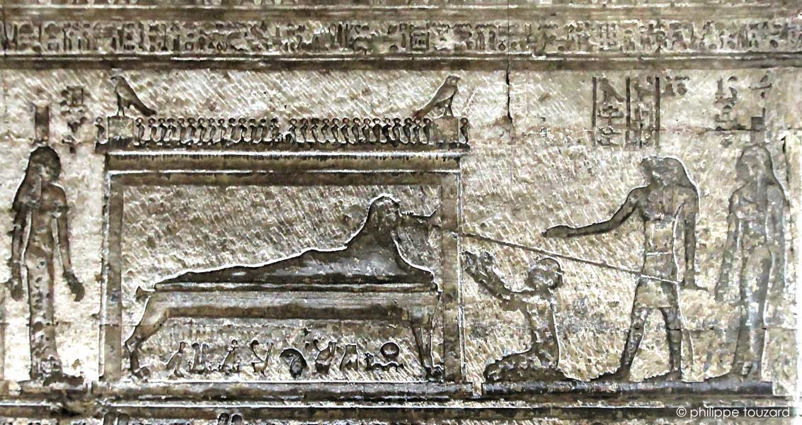 L'Osiris allongé sur le ventre ne porte pas de nom. Cette scène concerne probablement Dendera compte-tenu de sa position entre Busiris et Abydos. Des représentations de couronnes sont placées sous le lit. Harendotés, fils d'Osiris, Le grand dieu qui réside dans Iounet (Dendera) lui insuffle la vie (?). À droite Isis, la grande, la mère du dieu et à gauche, Nephtys se tiennent sur des socles (statues en bois doré, d'une coudée).