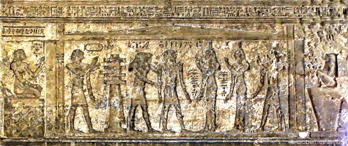 Au milieu, Osiris, le pilier djed dans Djedou (Busiris, aujourd'hui Abousir) est devant Isis suivie de Nephtys. Devant le pilier Djed, Hors fils d'Isis. Le roi (cartouche vide) assiste à la scène qui se passe dans une tente d'apparat. Osiris est également représenté sous la forme du pilier Djed à gauche. Chentayt de Busiris est agenouillée à l'extérieur de la chapelle à gauche. Les 4 fils d'Horus se fondent dans une seule entité, un babouin de bois enduit de plus d'un mètre (à droite). Soirées vivant,