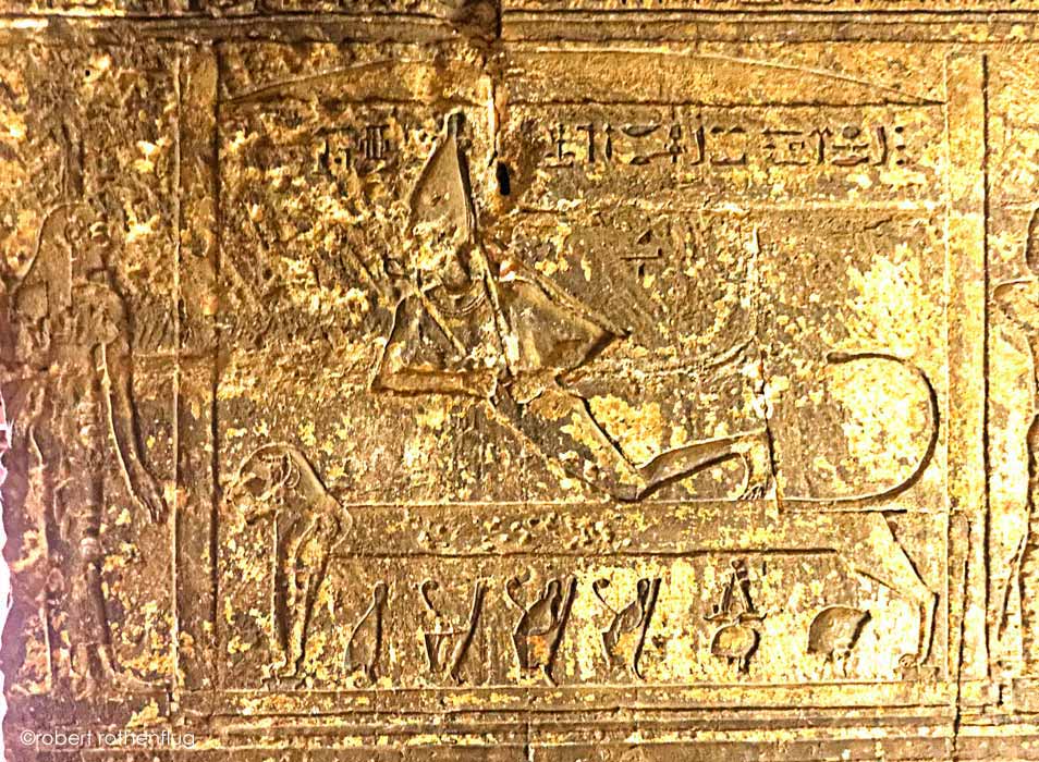 À gauche, le roi fumigène de l'encens (la vue est incomplète). Osiris de Dendara est momifié par Anubis. Son héritier est représenté 2 fois : en faucon et comme Harsiésis, dieu à tête de faucon. Les pleureuses sont Chentayt à gauche et Merkhetès à droite.