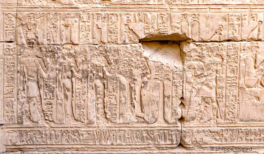 Compte-tenu de la dégradation de la paroi à cet endroit, seules subsistent 3 représentations des 7 divinités figurées comme des oiseaux à tête humaine ou animale. Ce sont les enfants de Tanen enterrés à Memphis, dieux de l'écriture souvent liés à un contexte de glorification.