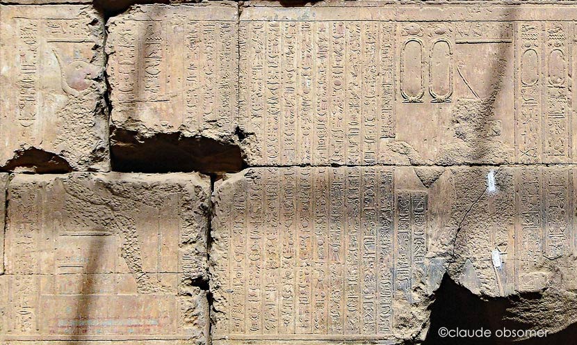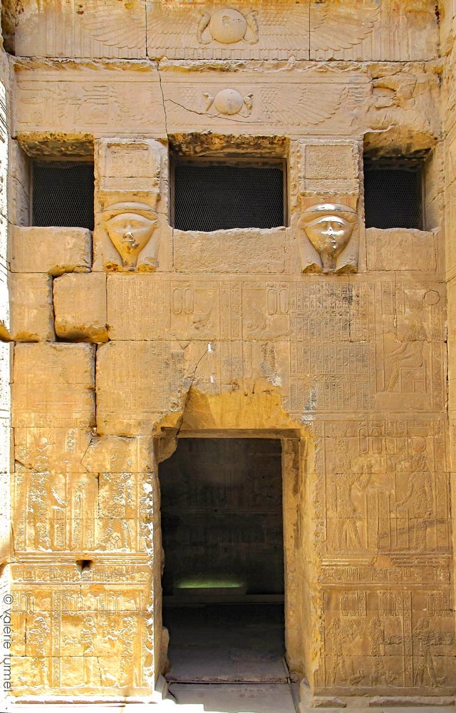 Cette paroi constitue la paroi Nord de la cour située devant la salle pure ou Ouâbet. Des disques ailés et des têtes d'Hathor décorent cette façade, ainsi que différentes scènes.