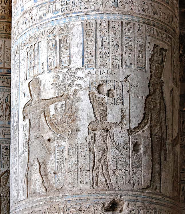 le roi (Claude) offre des branches de saule à Hathor accompagnée d'Horus. Le saule d'héliopolis fait référence à la terre la plus sacrée du pays.