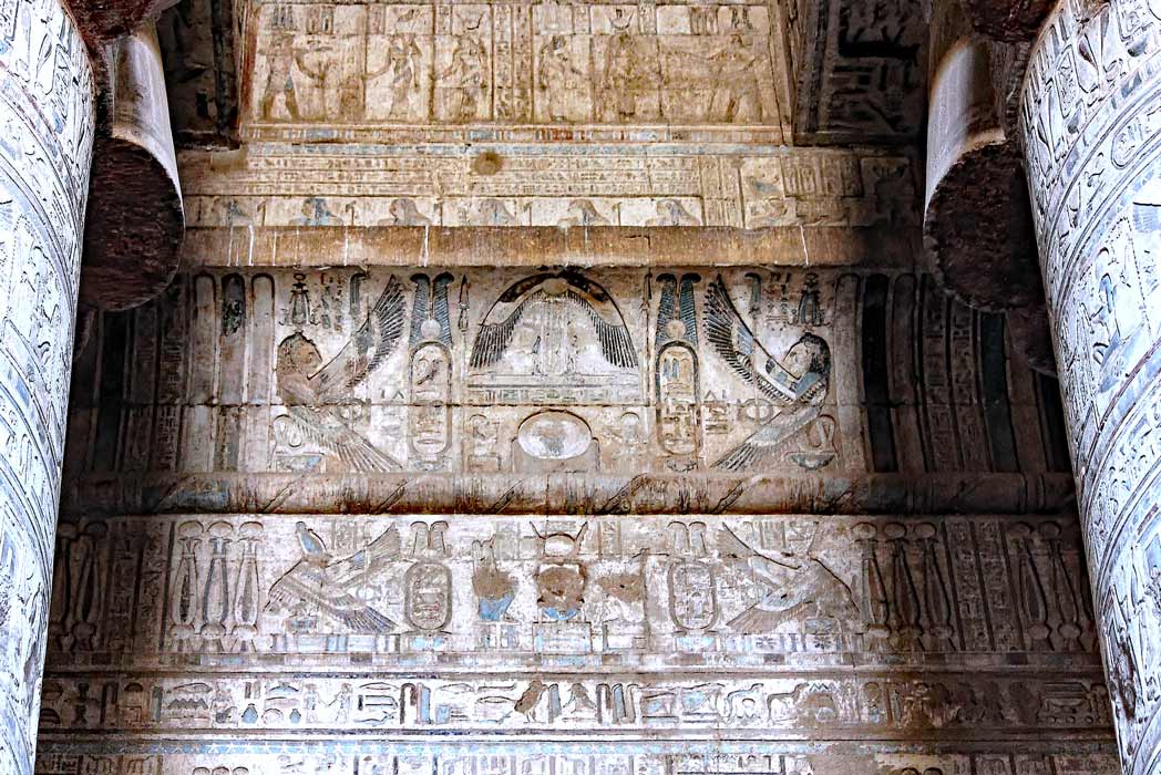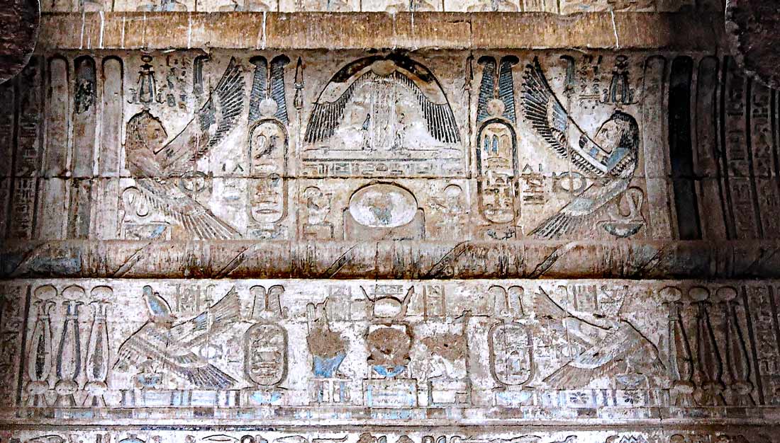 Ce tableau se répète 4 fois : du côté Est avec Isis-Hathor, Hathor, Hathor et 15 uræus protecteurs. Du côté Ouest, Hathor, Isis-Hathor, Hathor et 15 uræus protecteurs. Ainsi placés au centre, 30 uræus protègent 30 jours du mois.