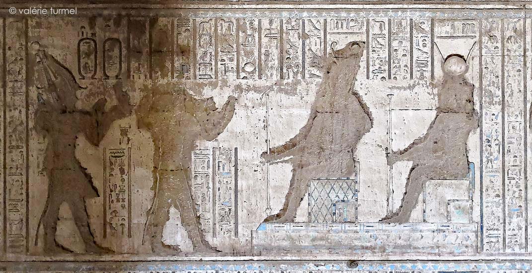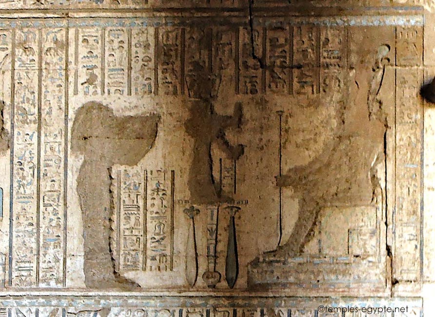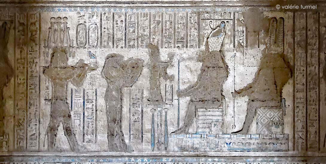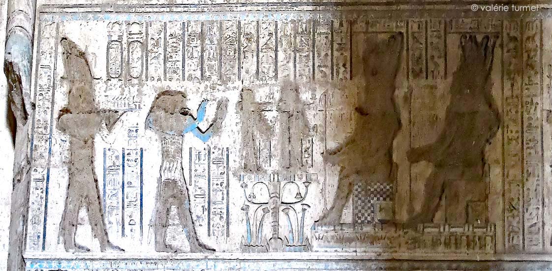 Le roi porte la Double couronne pour Horus, gardien de la fonction royale. Hehou de l'Ogdoade joue l'intermédiaire. Horus est accompagné d'Hathor.