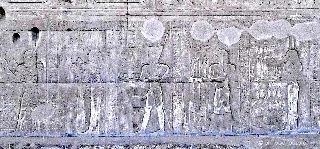 Le roi, avant-dernier personnage à gauche, verse l'au pour purifier. Devant le roi, la Maât est posée sur un socle. Un enfant-dieu tend un sistre au roi tandis qu'un autre est tourné vers les dieux.