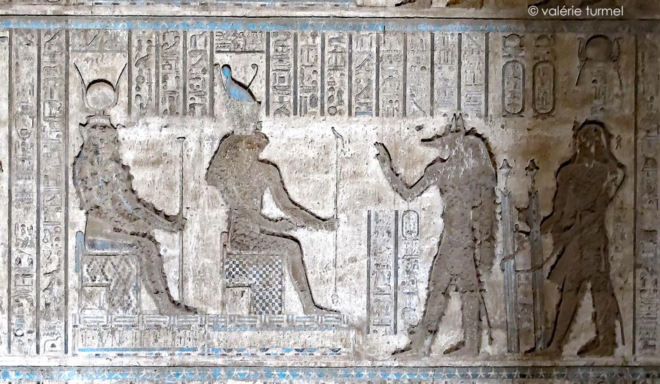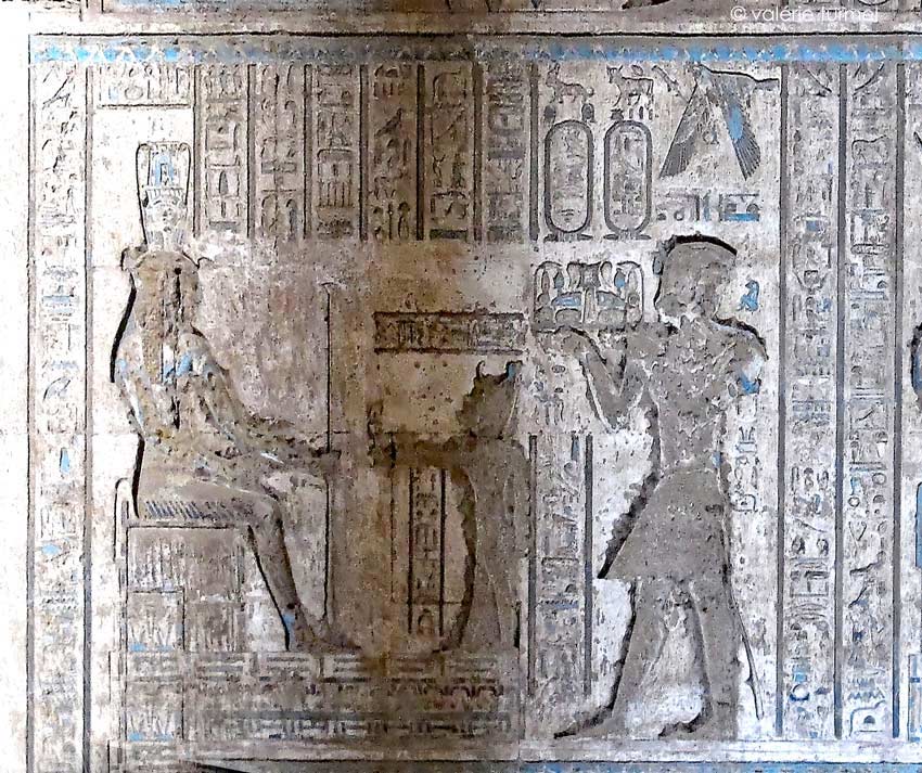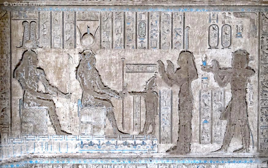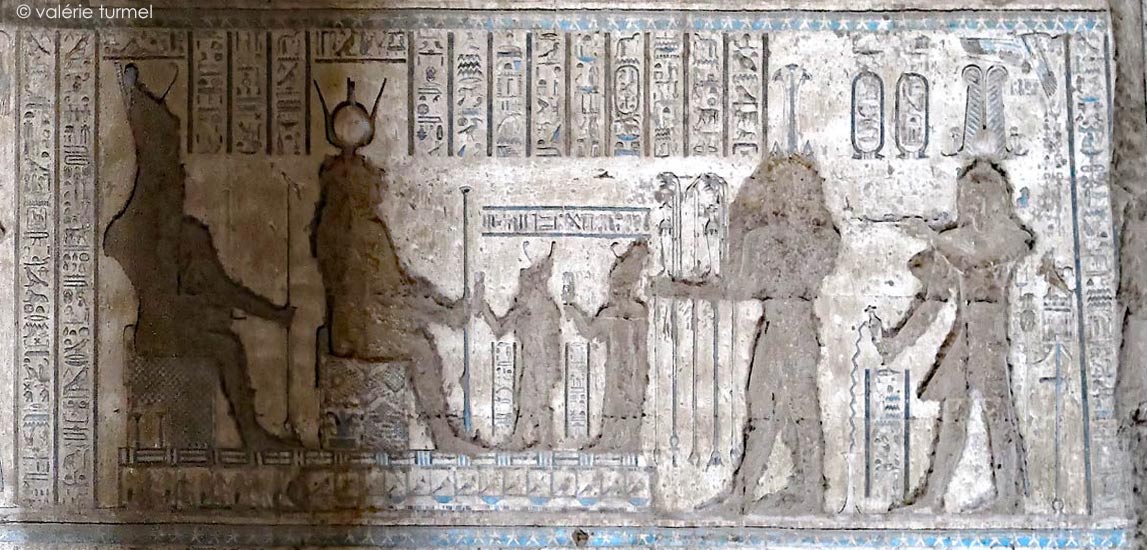 L'e roi offre un plateau de victuailles à Hathor. Un dieu-enfant joue du sistre.. Ivresse et satiété sont les corollaires de toutes les cérémonies. Les épithètes d'Hathor sont parmi les plus anciens : maîtresse des Deux-Terres, disque solaire féminin, maîtresse des pains.