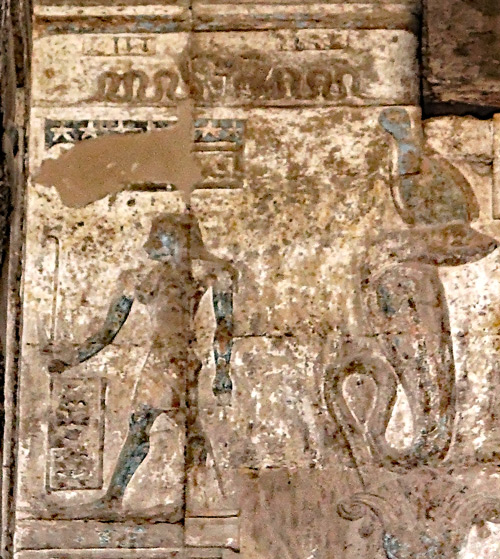 Dans les côtés, 18 gardiens debout gardent les angles du pronaos. Ils sont accompagnés du Gardien-Serpent tutélaire du temple, Fils d'Hathor, Agathodémon qui veille sur le temple des Sistres.