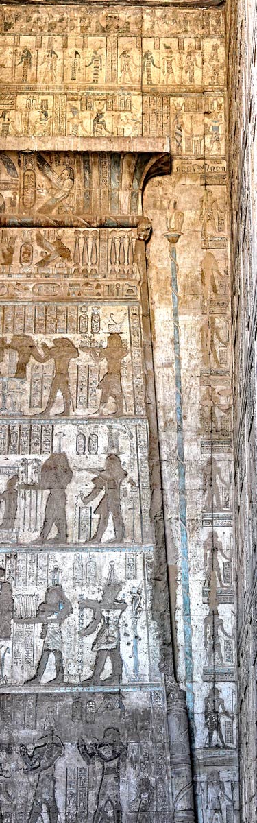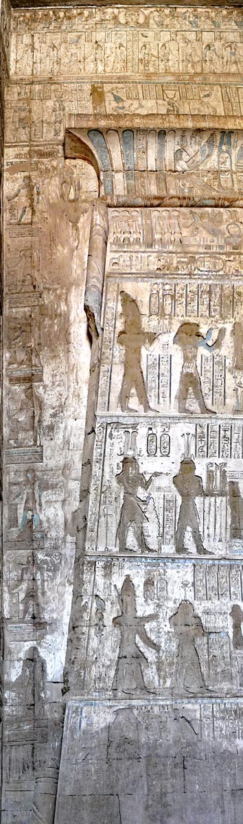 Au dessus de la corniche, les scènes décrivent le royaume des dieux. et l'intronisation des déesses.
