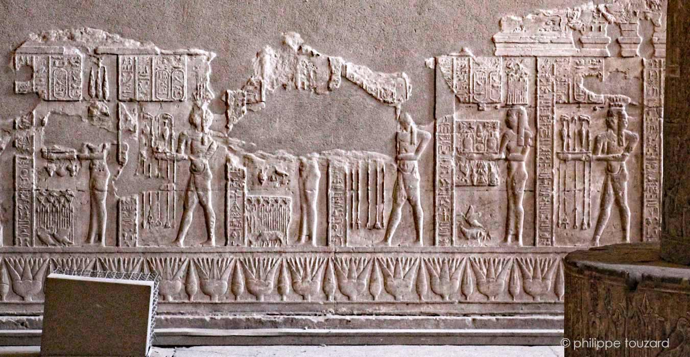 Sur le linteau, le roi est précédé par le Nil qui apporte l'eau des purifications. Devant eux, Isis, Osiris, Harsomtous, puis Hathor, Harsiésis et Harsomtous (p.412 du Pronaos).