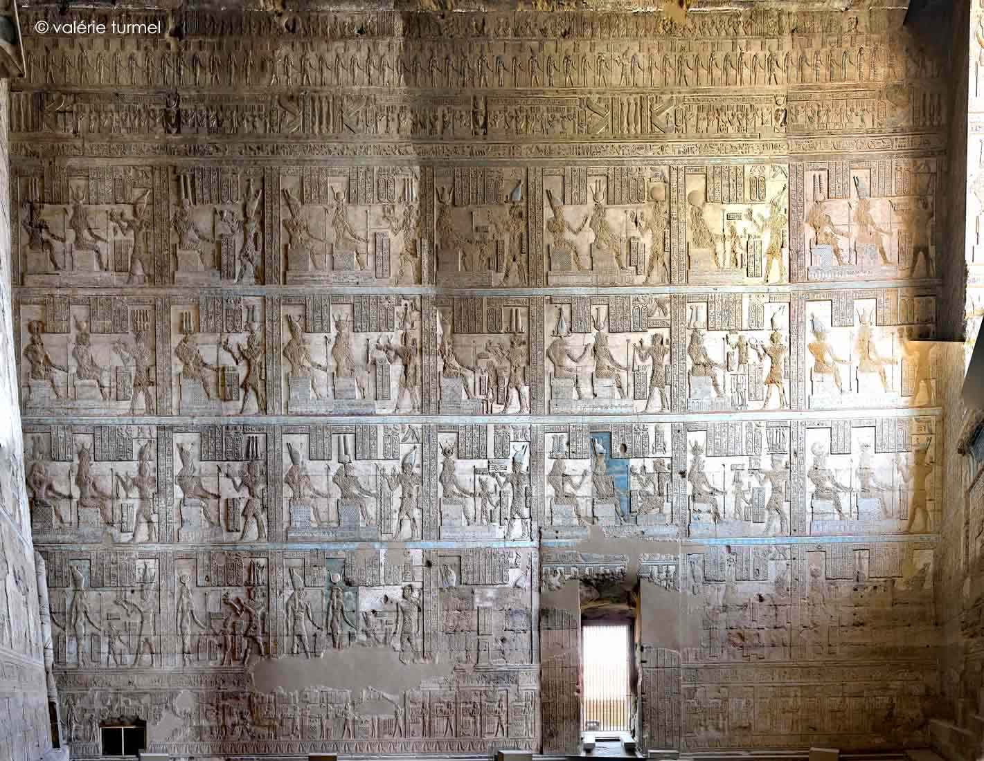 Les parois latérales contiennent 4 registres de scènes, un soubassement et différents bandeaux de textes ou autres scènes. Le registre du bas est consacré au rituel et à la fondation du temple. Le soubassement montre un défilé d'offrandes dirigé par le roi. Au dessus des scènes d'offrandes se situent un bandeau de texte, une frise de dieux, les dieux rzprésentant un mois de l'année (ici le mois de mesorê, le dernier mois de l'année) et une autre frise. Ces deux derniers bandeaux sont présentés dans la partie traitant des architraves (cf. le plafond).