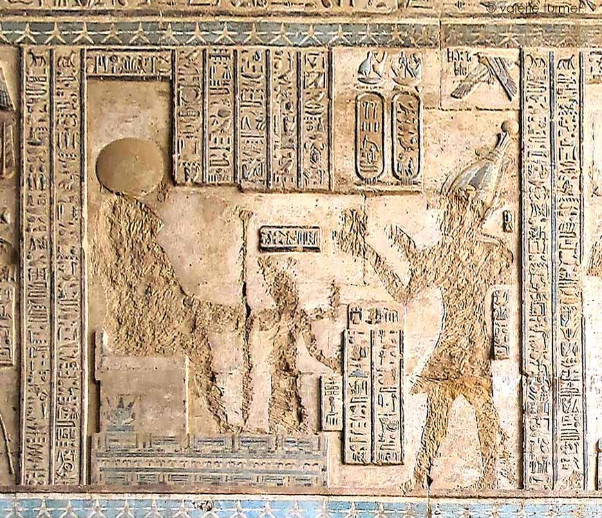 Personnifié par l'empereur Néron comme dans tous les tableaux, le roi agite les sistres et le collier menit (produisant également un bruit apaisant) pour apaiser la déesse Hathor accompagnée de son fils Ihy, dieu de la musique.
