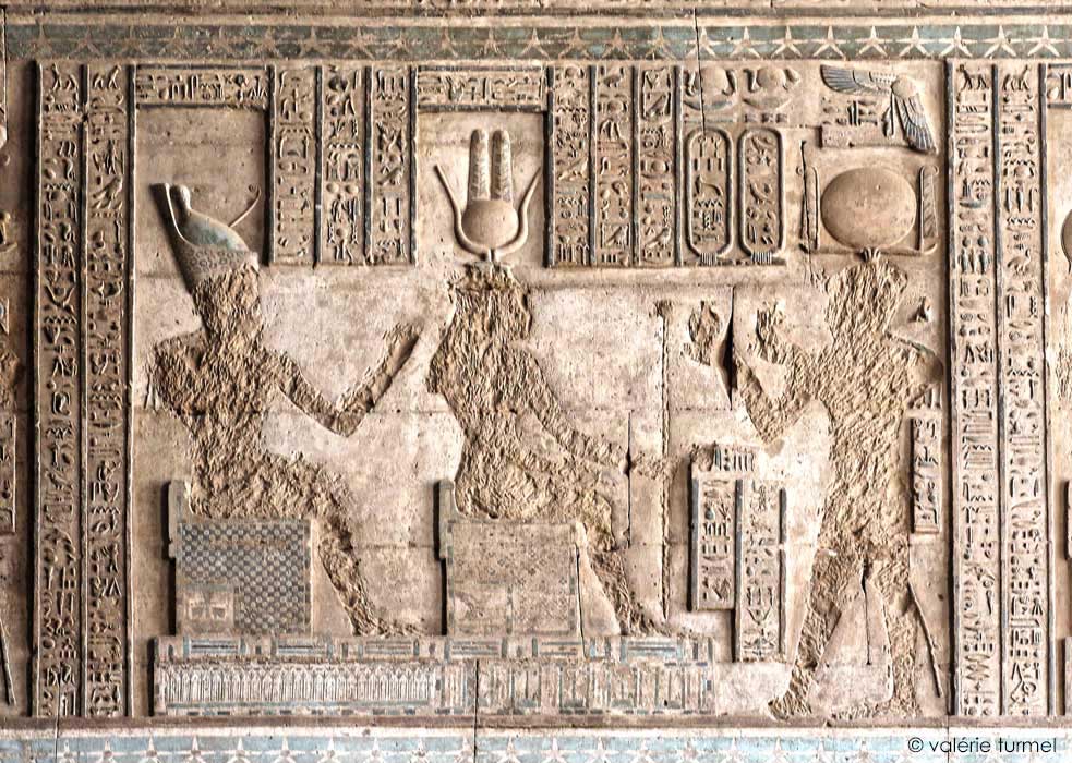 Le roi présente l'objet clepsydre à Hathor . Un dieu-enfant, sans doute Ihy se tient debout devant Hathor .