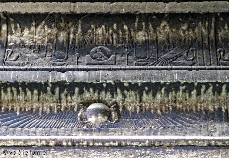 Les tableaux sont placés dans l'encorbellement de la corniche. Au premier niveau, la déesse est assise dans l'horizon. Rê et le dieu-Lune encadrent la déesse. Le temple horizon reçoit les rayons du soleil envoyés par Rê. Deux cobras déploient leurs ailes devant les cartouches royaux. Un seul tableau, travée Ouest,montre Isis dans l'horizon; les autres sont consacrés à Hathor.