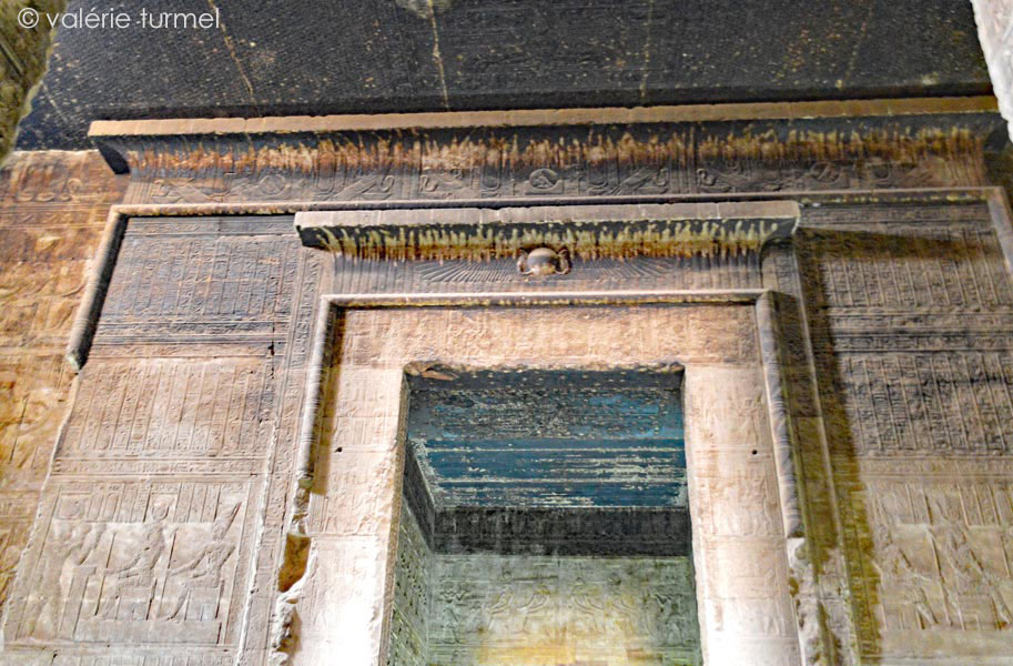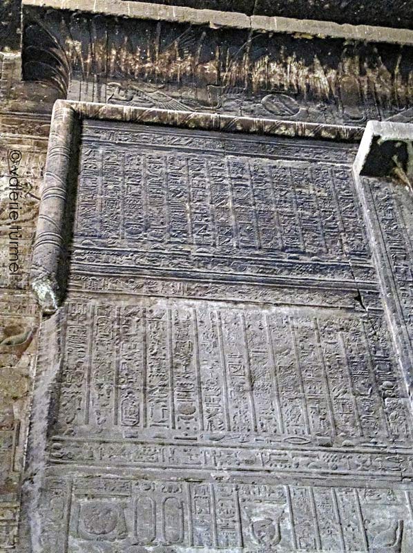 - les parties du corps depuis le ventre jusqu'au orteils, ainsi que différents lieux sacrés du temple. (2 textes à droite de la façade).