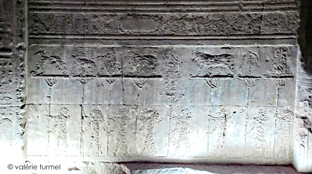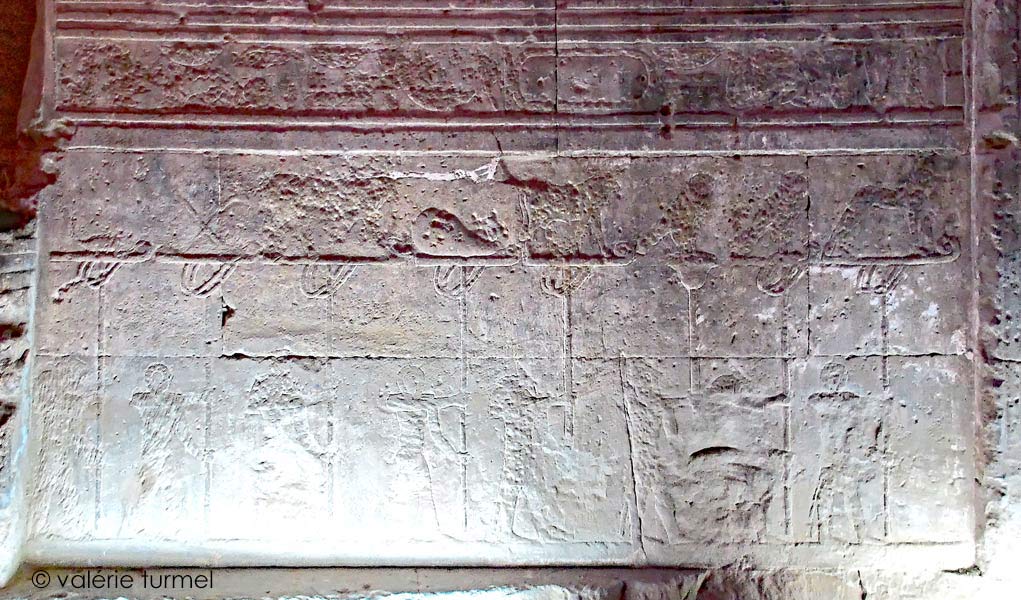 Sur les soubassements, sont représentés des défilés de pavois (ou enseignes) emmenés par Oupouaout, l'ouvreur des chemins. Ils sont tenus par des signes Ankh et Ouas alternés, personnifiés avec des bras et de jambes.(cf. Mariette, Dendera, tome I, planche 38).