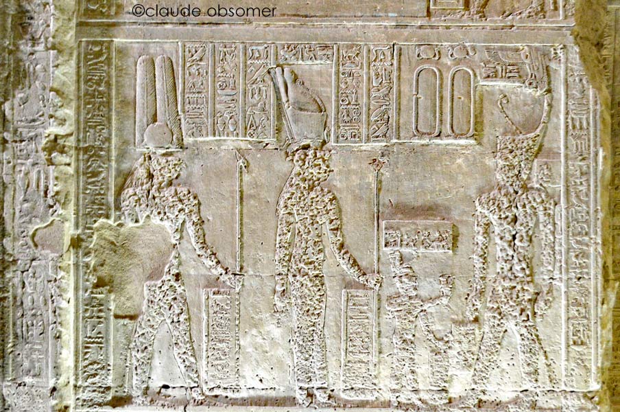 Le roi (cartouches vides) se tient devant Sis la Grande, mère du dieu, qui réside dans Iounet et Harsomtous, fils d'Hathor. Un enfant dieu joue du sistre tourné vers le roi.