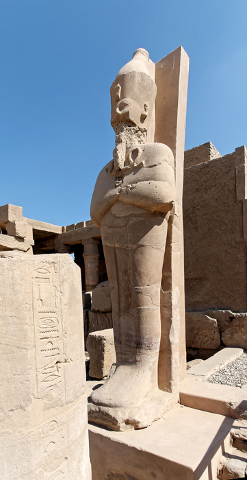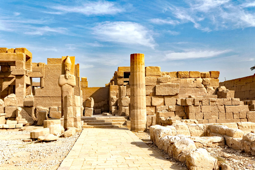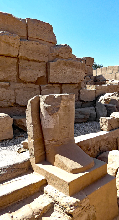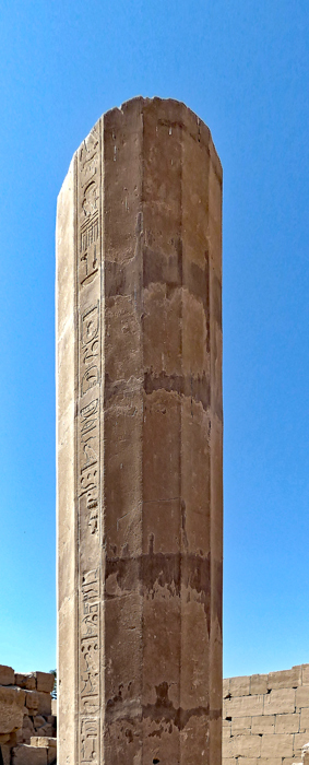 Dex colonnes de granit polygonales à 16 pans se trouvent devant l'entrée. Celle de gauche est pratiquement intacte. Le texte suivant y est gravé : Thoutmosis III a élevé "un grand palaix Akhmenou en belle pierre blanche de Aïn". L'inscription a été usurpée par Sethy II.