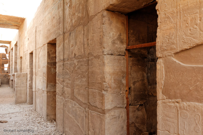 La porte Sud permet d'accéder, après un petit vestibule, à ce long couloir sur lequel s'ouvrent les portes de 9 magasins (salles de VII à XV de Porter et Moss). Six d'entre elles sont présentées ici. Les 2 dernières (XIV et XV) sont surélevées. Des objets de culte devaient être rangées. Sur le mur en face des portes, assez endommagé, sont décrites des scènes de la fête Sed (voir salle