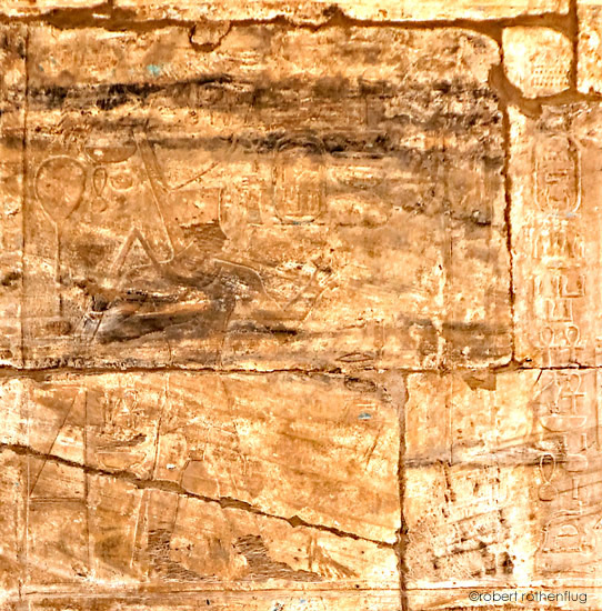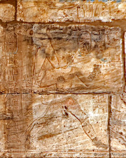 En haut, différents pavois sont portés par des signes Ankh et Ouas.