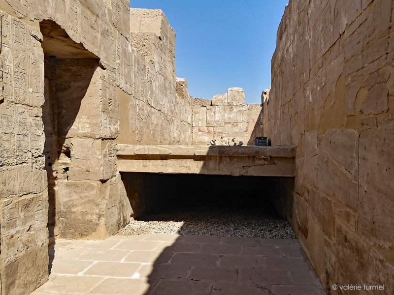 Quatre salles décorées faisant office de magasins sont alignées d'Est en Ouest. Elles bordent au Nord le temple et comprennent toutes un plateau surélevé permettant de mettre les denrées à l'abri des animaux nuisibles. La vue ci-dessus montre le côté Ouest de la salle XLII; (chambre 3 de Barguet, p.206; les autres magasins portent les numéros 4 à 6).