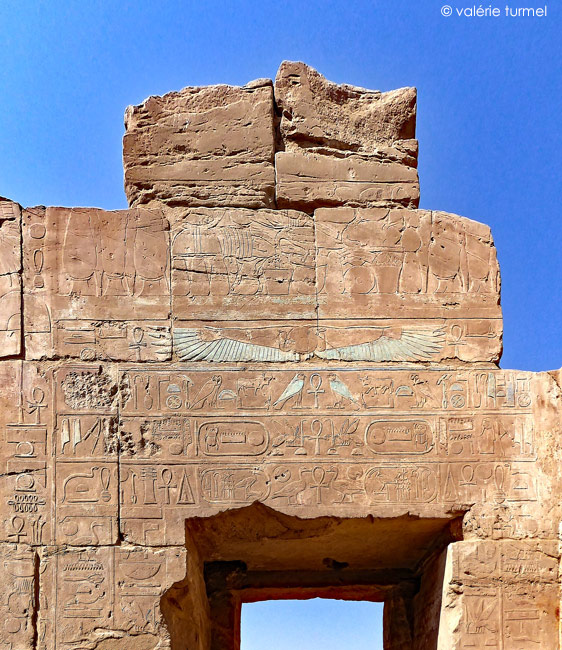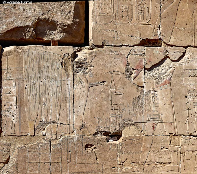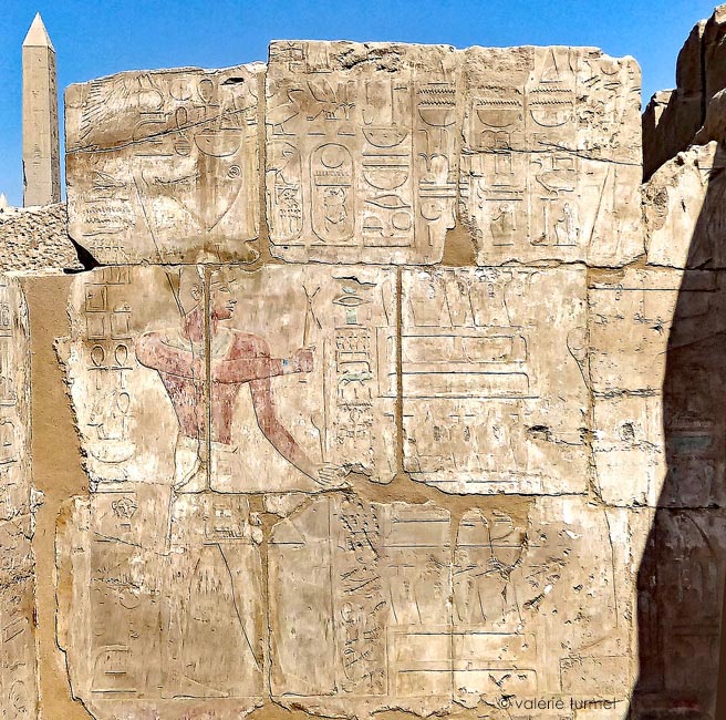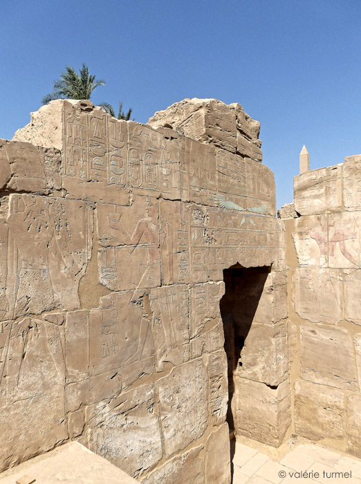 Le coin Sud-Ouest du magasin montre l'emplacement de la porte et le début  du plateau en bas à gauche. En haut à droite se voit le haut de l'obélisque d'Hatchepsout