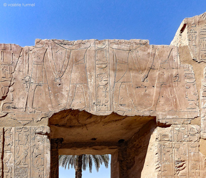 Les montants de la porte sont inscrits avec les titulatures de Thoutmosis III. Le linteau montre une double scènes : dans laquelle le roi tient la main d'un dieu et en reçoit la vie.