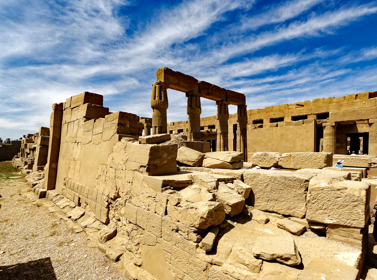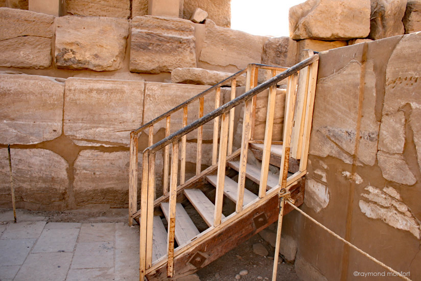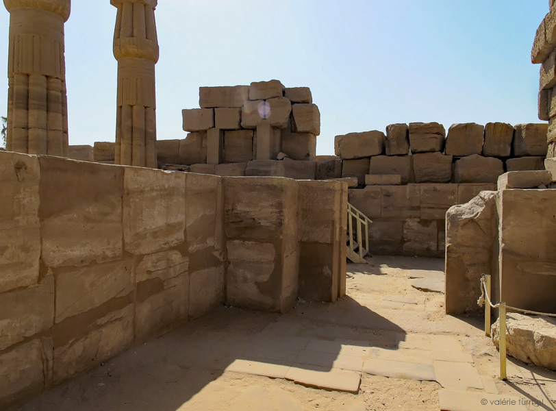 Ce couloir permet d'accéder aux différentes salles à droite, dites "sanctuaires" et à la salle du "jardin botanique". Cependant pour cette dernière, le chemin est entravé à cause d'un petit muret qui rendait difficile le passage par les prêtres portant les offrandes. Aujourd'hui un escalier en bois permet de le franchir. 'voir ci-dessous).