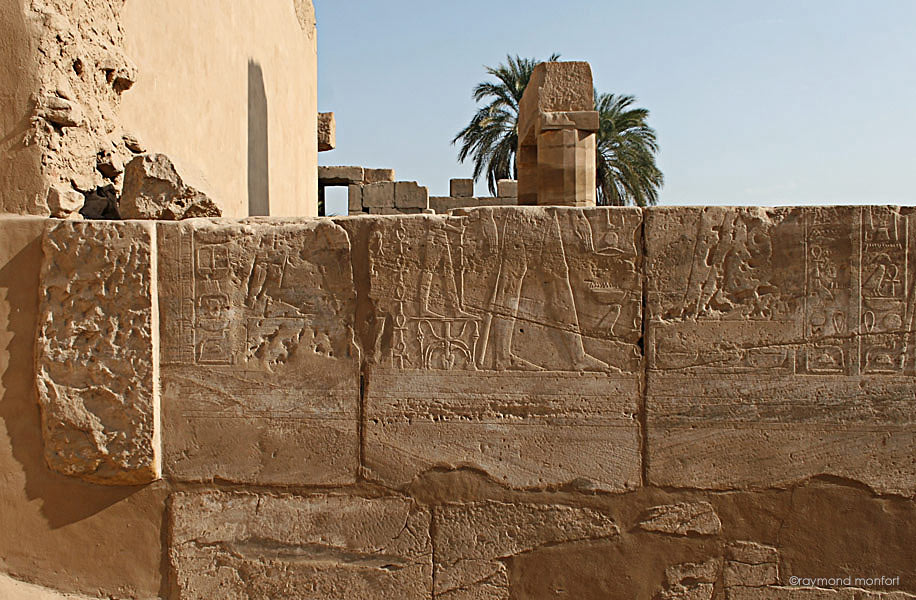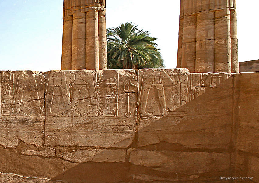 Suite des scènes de la paroi Nord : à gauche, le roi est couronné par 2 dieux. A droite, le roi est suivi de son ka représenté de façon symbolique. Le roi est debout devant Amon-Rê sans doute ithyphallique comme Min dont on voit la chapelle derrière lui.