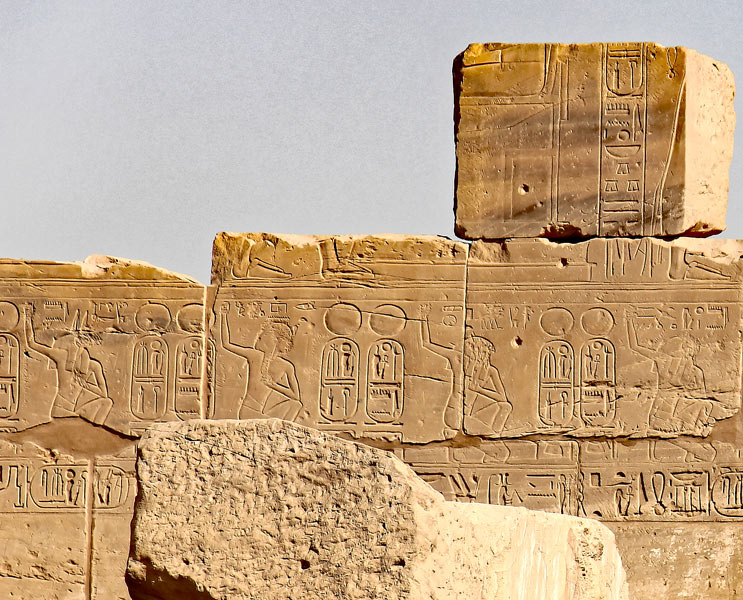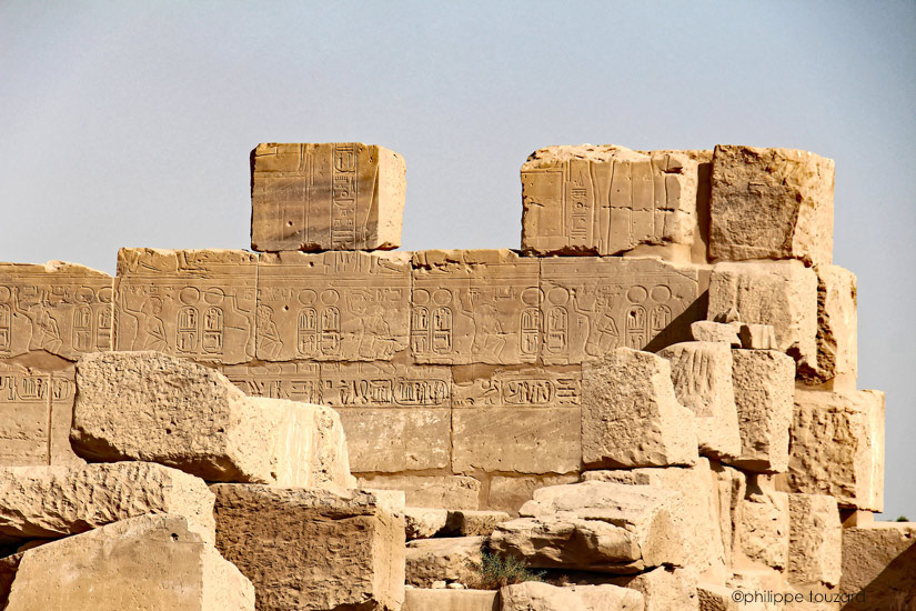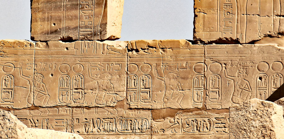 Entre chaque personnages sont représentés la titulature de Thoutmosis III.
