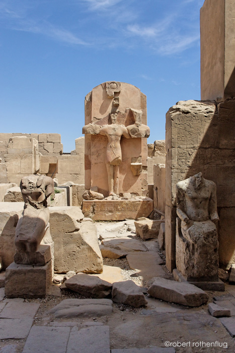 Dans cette salle, on peut voir les restes d'un groupe statuaire où le roi était encadré par Amon et Mout. Devant, deux autres statues du roi.