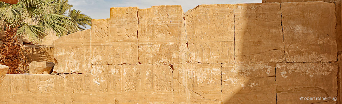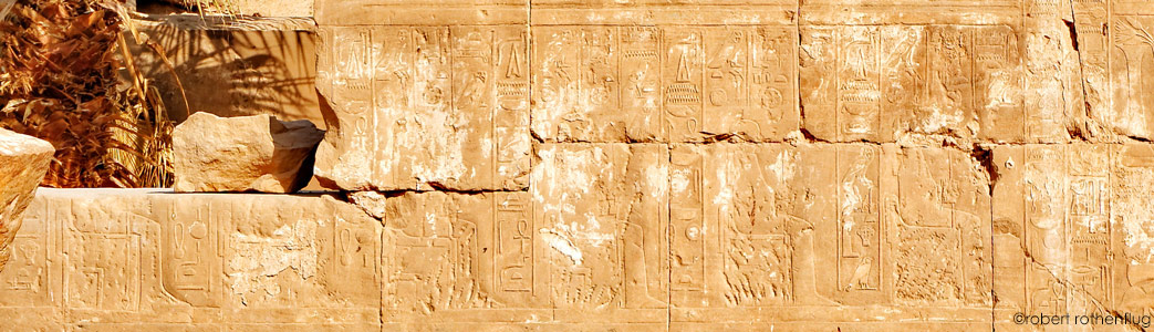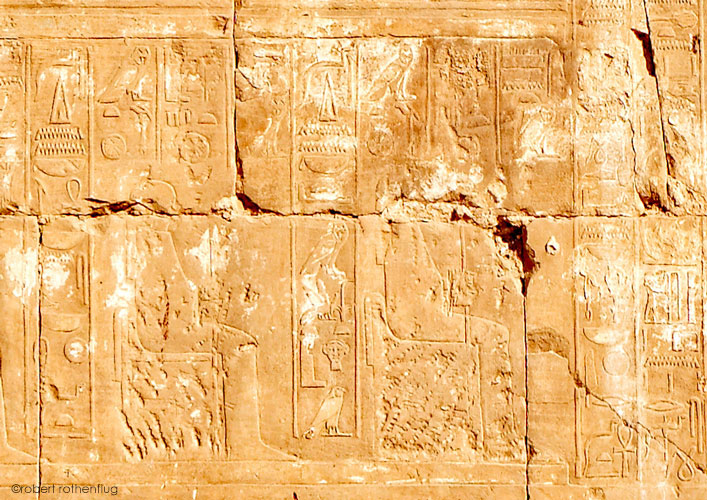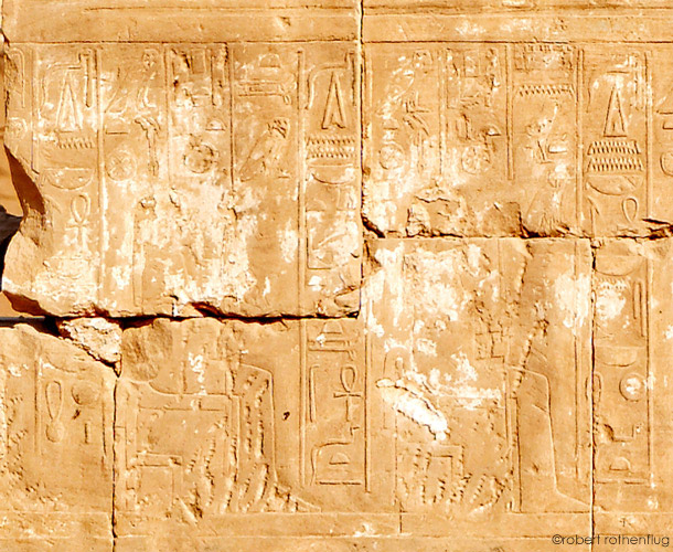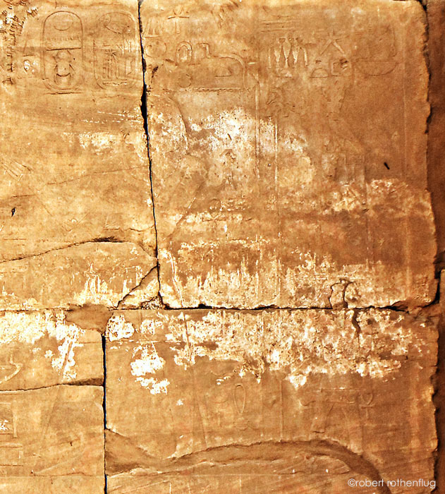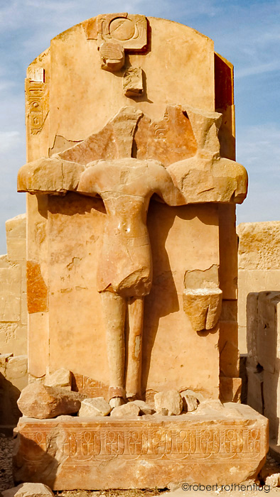 Ce groupe a été probablement détruit pour ressembler à une croix chrétienne. On peut voir encore le nom du roi en haut à gauche et la frise de signes ank et djed.