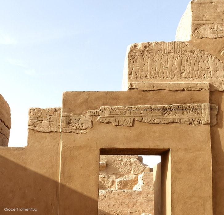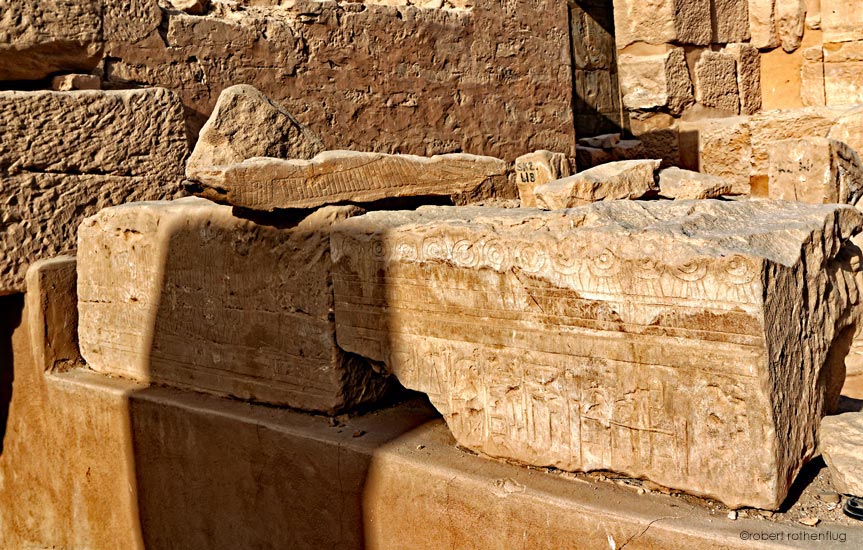 Différents blocs décorés gisent par terre. Le bloc de droite clairement fait partie de la scène avec la barque de Sokar, comme le montre clairement la photo de Barguet (p.184) faite lorsqu'il était encore en place. Barguet propose la traduction suivante d'une partie des inscriptions : "accéder à la tente (de purification)".