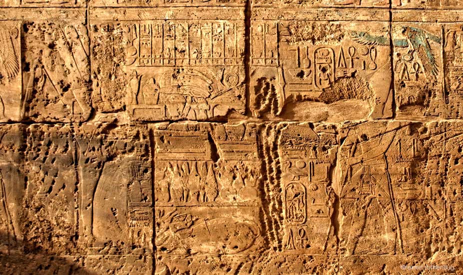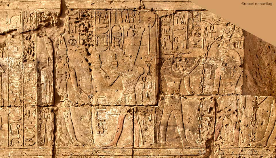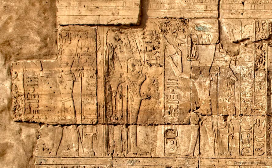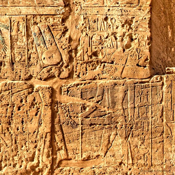 Registre du haut : de droite à gauche, le roi est purifié par Khnoum et un autre dieu (détruit); ensuite il offre du lait à Amon.
