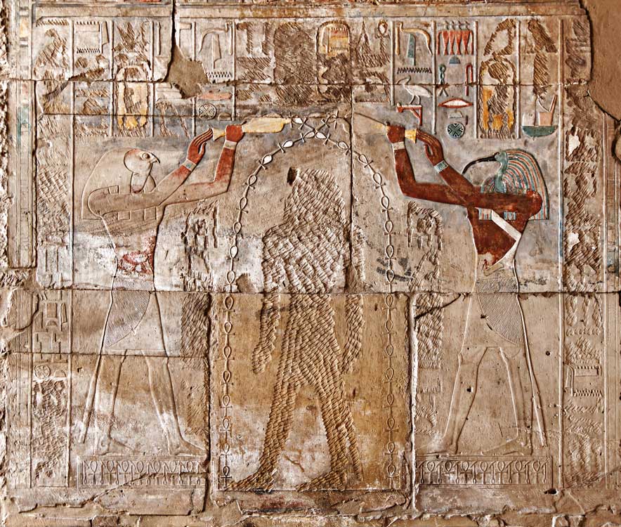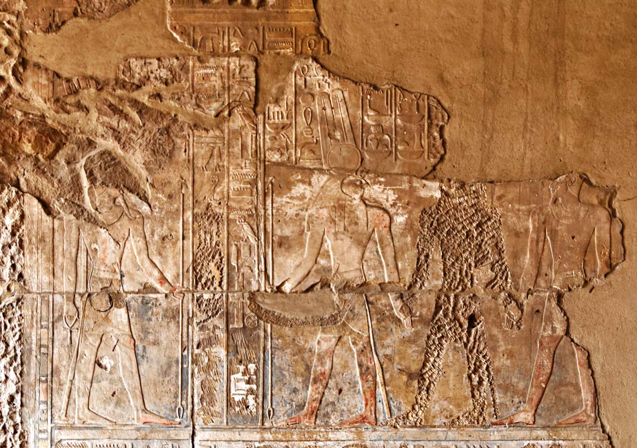 Dans une scène très fragmentaire, la reine (martelée) est amenée par Montou et Atoum(?) vers Amon. |