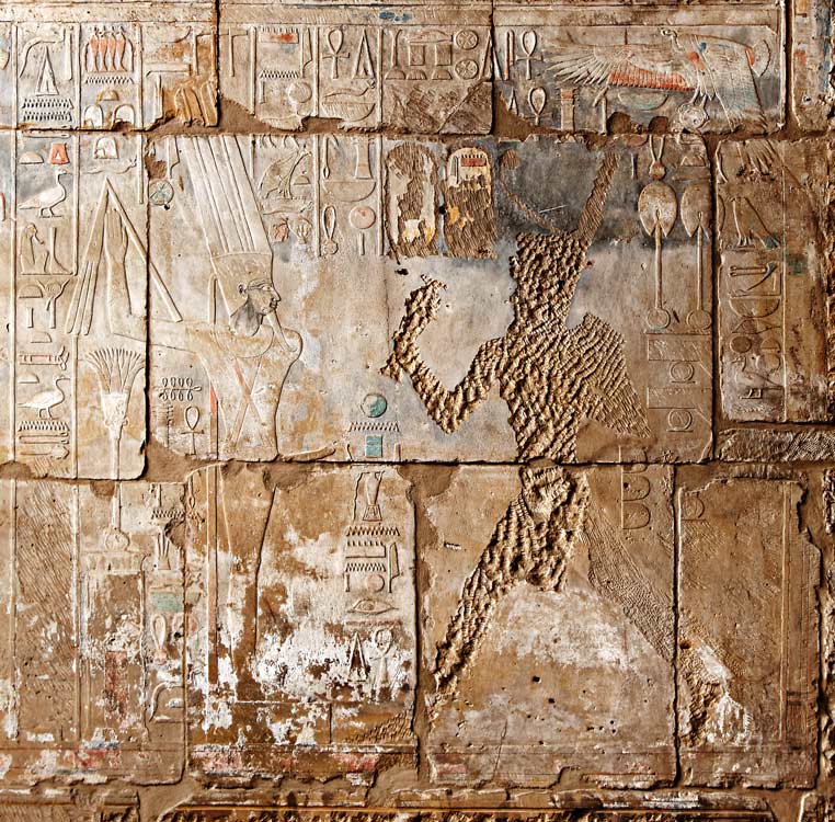 Tenant 2 vases, la reine accomplit une course rituelle devant Amon-Min. |