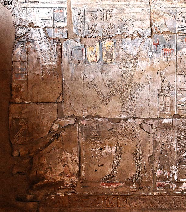 La reine offre 2 vases de vin(?) à Amon. La reine est martelée comme dans les autres scènes, mais son cartouche est encore visible. |