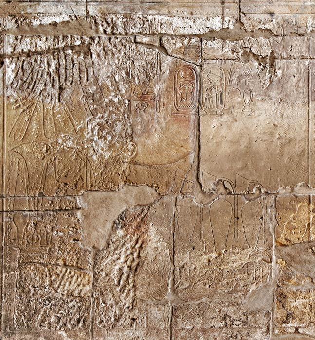 Le cartouche est celui de Thoumosis II. Ici la reine a été remplacée par une table d'offrandes à peine dessinée sous Thoutmosis III. Amon et son nom ont été abîmés sous Akhénaton.  |