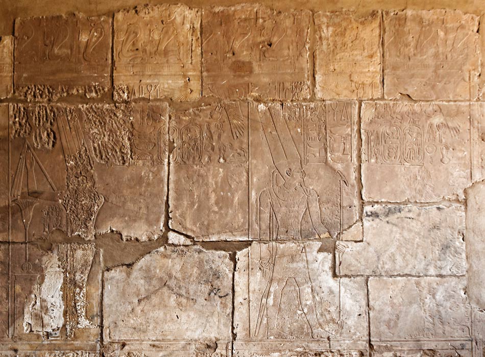 Le mur d'en face du mur du baptême n'est évidemment pas celui d'origine. C'est un mur d'une autre des salles d'Hatchepsout où l'image de la reine a été soigneusement effacée et ses cartouches remplacés par ceux de Thoutmosis III (scène de droite) ou Thoumosis II (scène de gauche). A droite, s'aperçoit encore une vague silhouette, mais à gauche la paroi est lisse. On ne sait pas quelles offrandes étaient présentées à Amon et Amon-Min. |