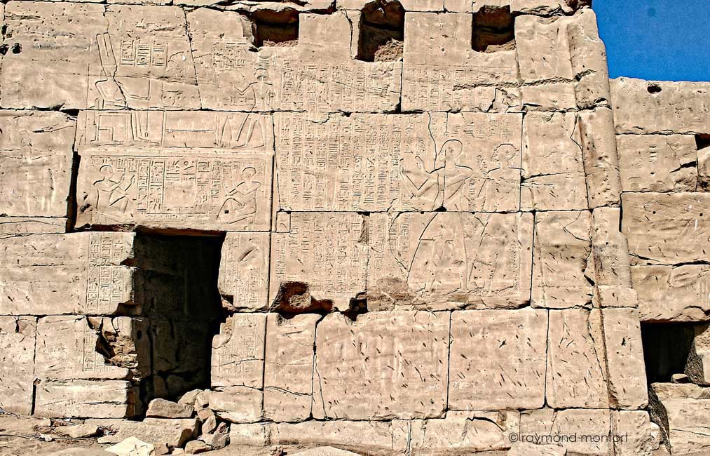 A gauche, la face Est du VIIIe pylône. La paroi du  mur entre les 2 pylônes est gravé de différentes scènes.