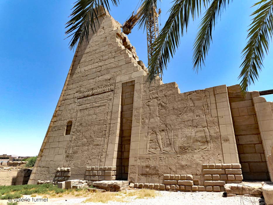 IÀ l'extrémité du pylône, à côté de la stéle, des graffiti représentent plusieurs divinités : en haut Mout est assise et en dessous, Amon, Mout et Ptolémée. Un texte de Néron est inscrit enn bas.