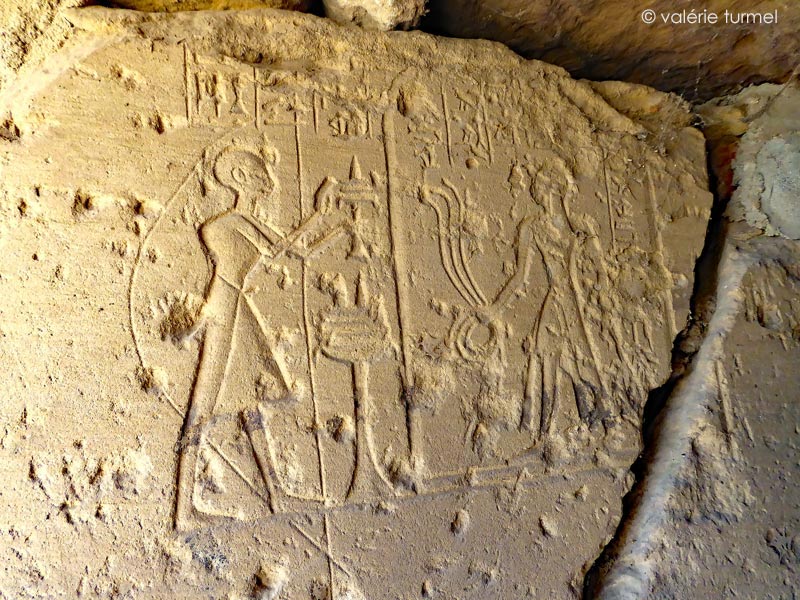 Un prêtre fait une offrande au dieu Ched qui tient 2 serpents à la main. Le dieu Ched "le sauveur" (en égyptien) est un dieu protecteur contre les morsures de serpent et de scorpions. Le graffito daterait de la XXIe dynastie.