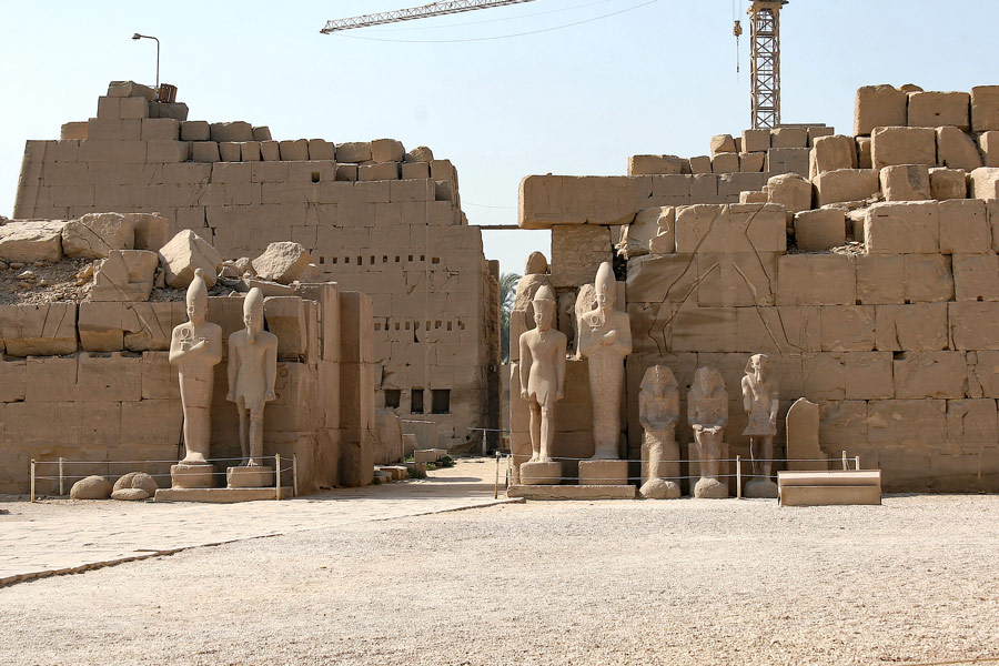 Les 2 môles du pylône sont également écroulés. . On reconnaît cependant la scène (répétée à satiété) du roi massacrant ses ennemis. Quatre colosses de Thoutmosis III (dont 2 osiriaques) usurpés par Ramsès IV se dressent de chaque côté de la porte. À l'arrière plan, le VIIIe pylône a conservé une certaine hauteur.