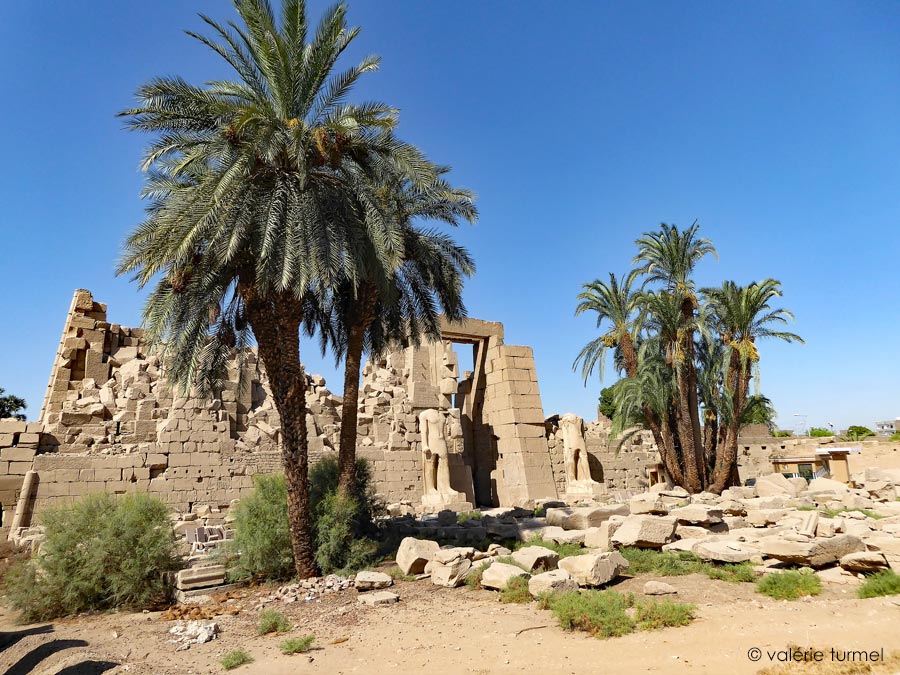 Le Xe pylône a été construit sous Horemheb. Il a été rempli avec des talatates d'Akhenaton. Les 2 côtés sont fortement détruits. De chaque côté de la porte, sont dressés deux colosses de calcaire usurpés par Ramsès II.